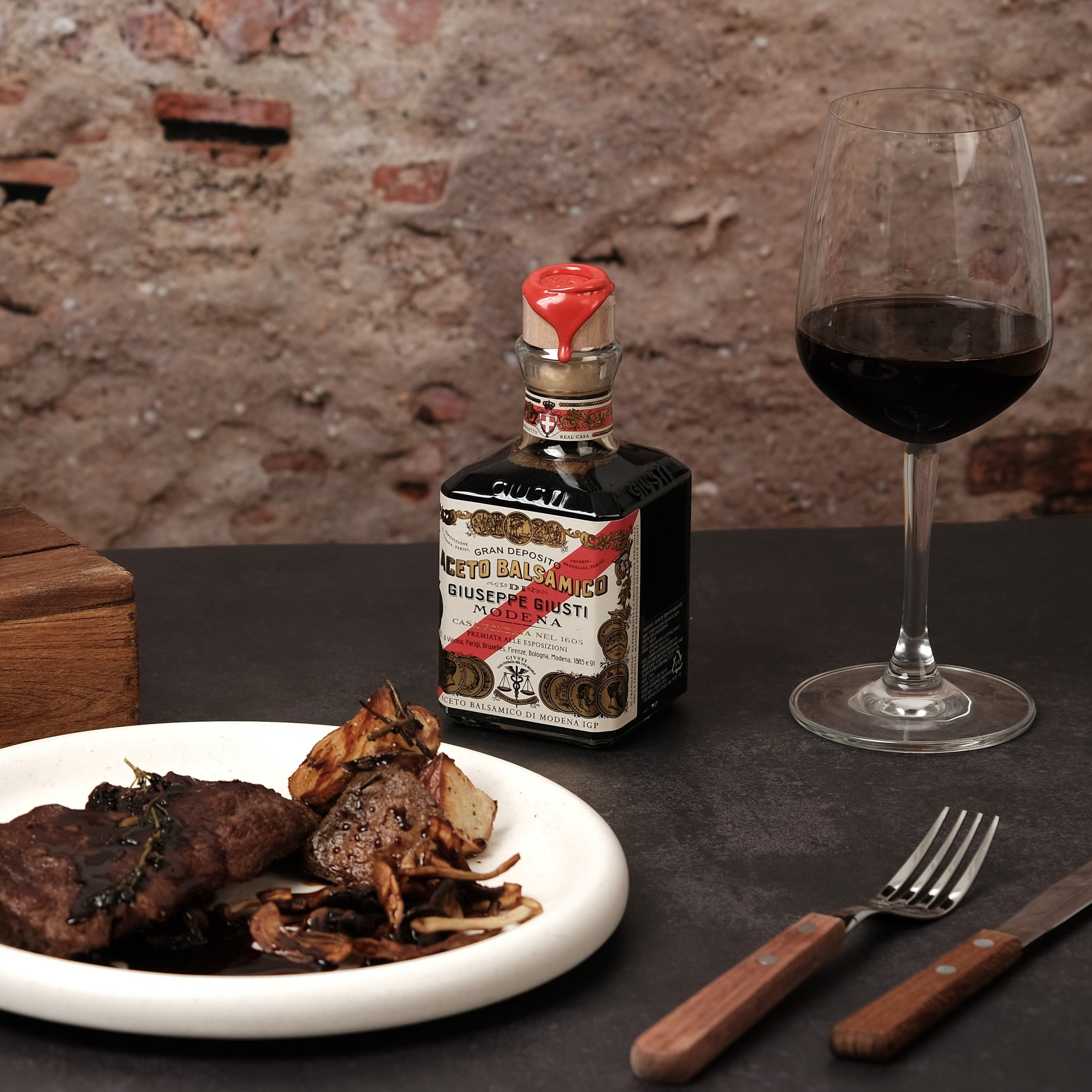 The ultimate pride and expression of the art of Giusti vinegars, the “Banda Rossa” was the personal gift from Uncle Giuseppe to family members. This elixir is of robust body and concentration, and is distinguished by its extraordinary complexity and rich bouquet of aromas.
