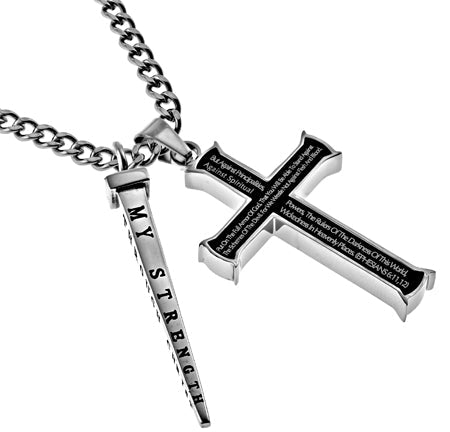 Men's Solid Stainless Steel Cross with high polish finish outer casing and ebony middle. Front and back Scripture is electroplated into the Cross. Cross size 1 3/4" x 1". Solid Stainless steel high polished “Nail” with 4 sided engraving and black enameling. Nail measures 1 ¾” x ¼” at widest point. Available on 20” or 24” high polish stainless steel curb chain. Both pieces are detachable. Every order comes with complimentary velvet gift bag. Orders ship in 1-2 business days from Phoenix, Arizona.