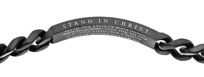 Men's 316L stainless steel powder coat black finished bracelet with sport mesh pattern perforations show underneath to high polish interior. Top side of bracelet reads scripture of choice. Bracelet measures 8 1/2” long. Every order comes with complimentary velvet gift bag. Orders ship in 1-2 business days from Phoenix, Arizona.