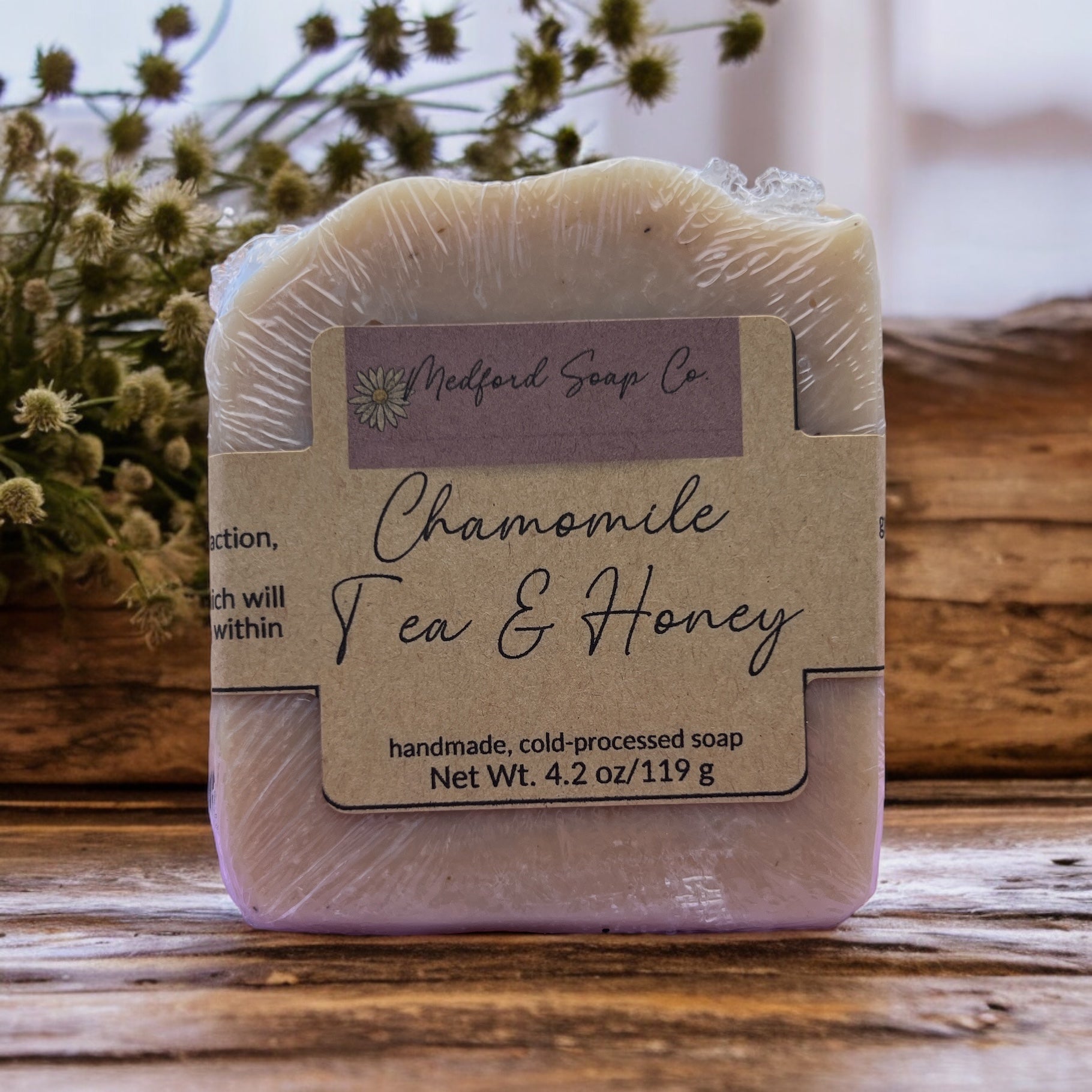 Ingredients:  olive oil, organic virgin coconut oil, shea butter, grapeseed oil, castor oil, sodium hydroxide, distilled water, chamomile tea, chamomile essential oil, chamomile powder, honey.