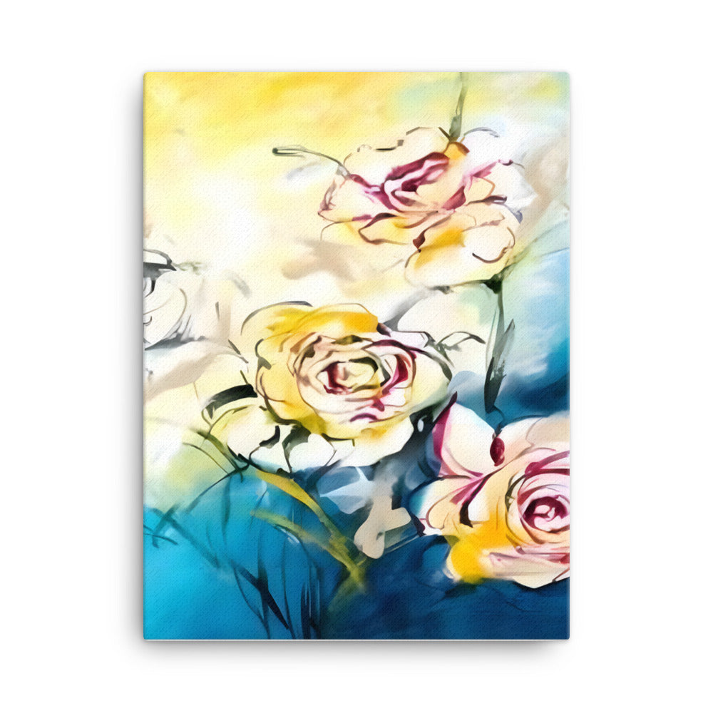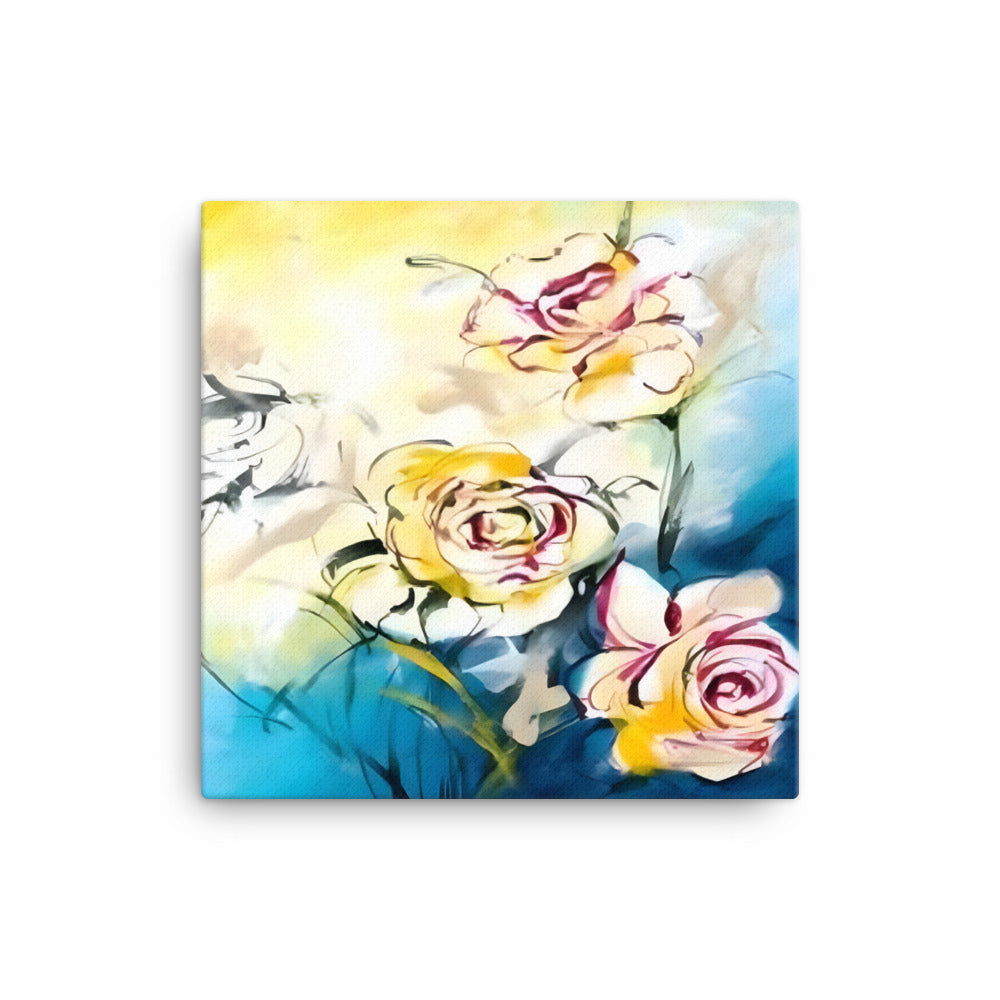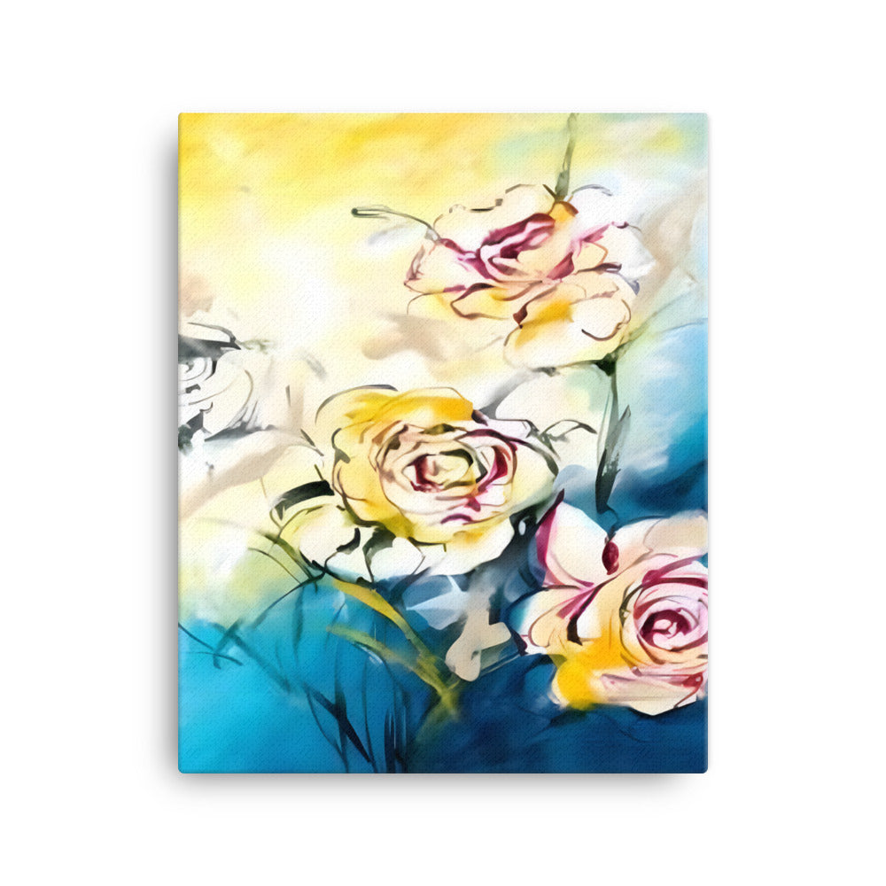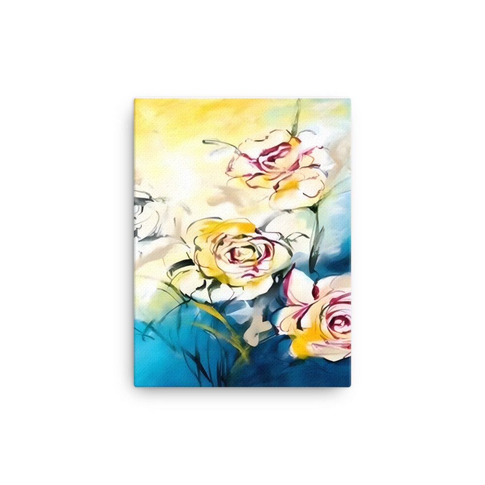 Introducing a stunning piece of wall art that is sure to capture your heart! This beautiful canvas print features three vibrant flowers in white, red, and yellow, set against a tranquil blue, white, and yellow background.