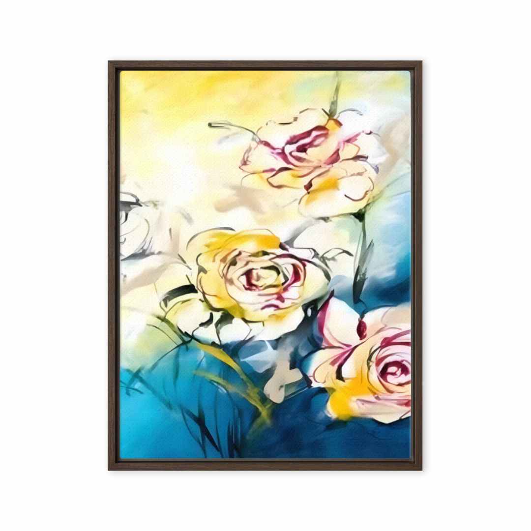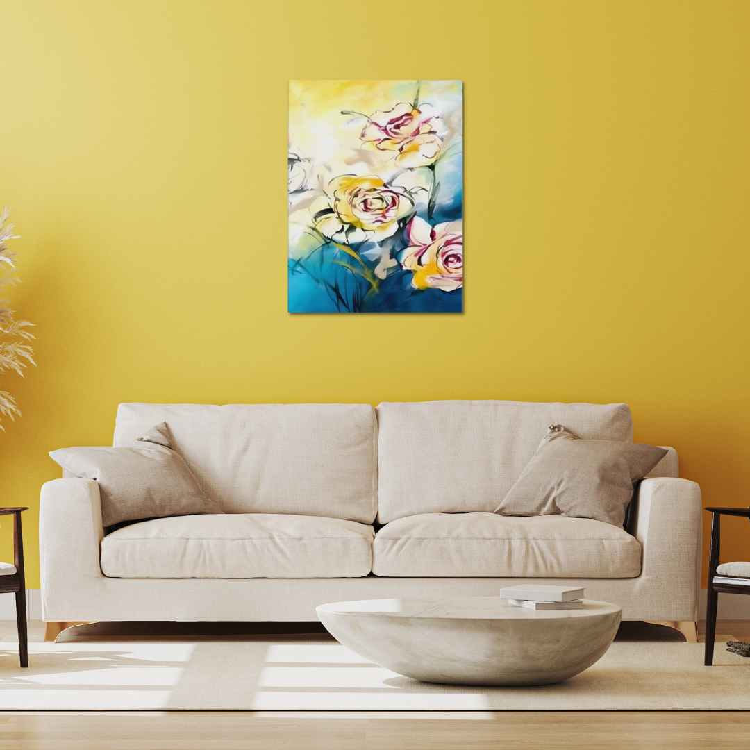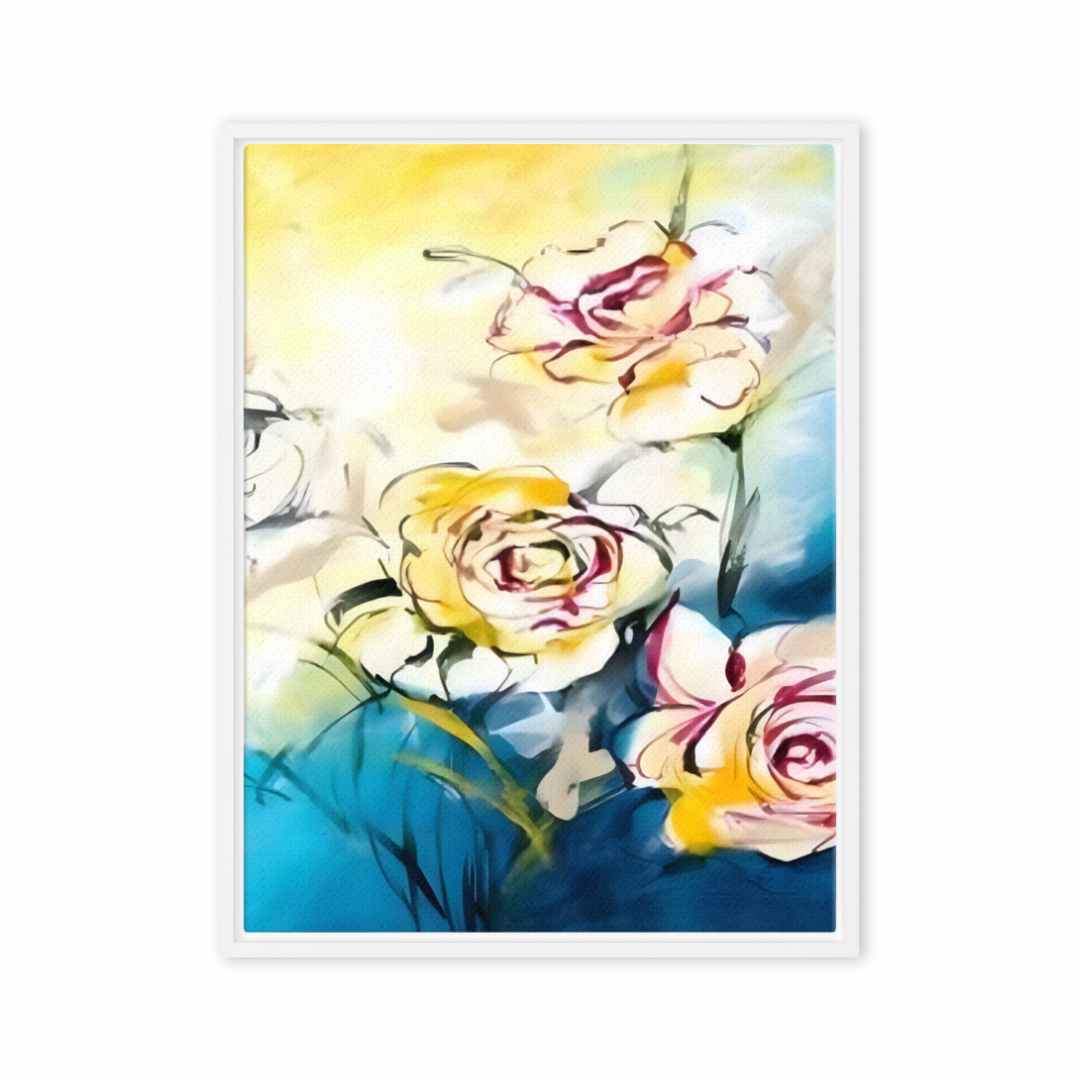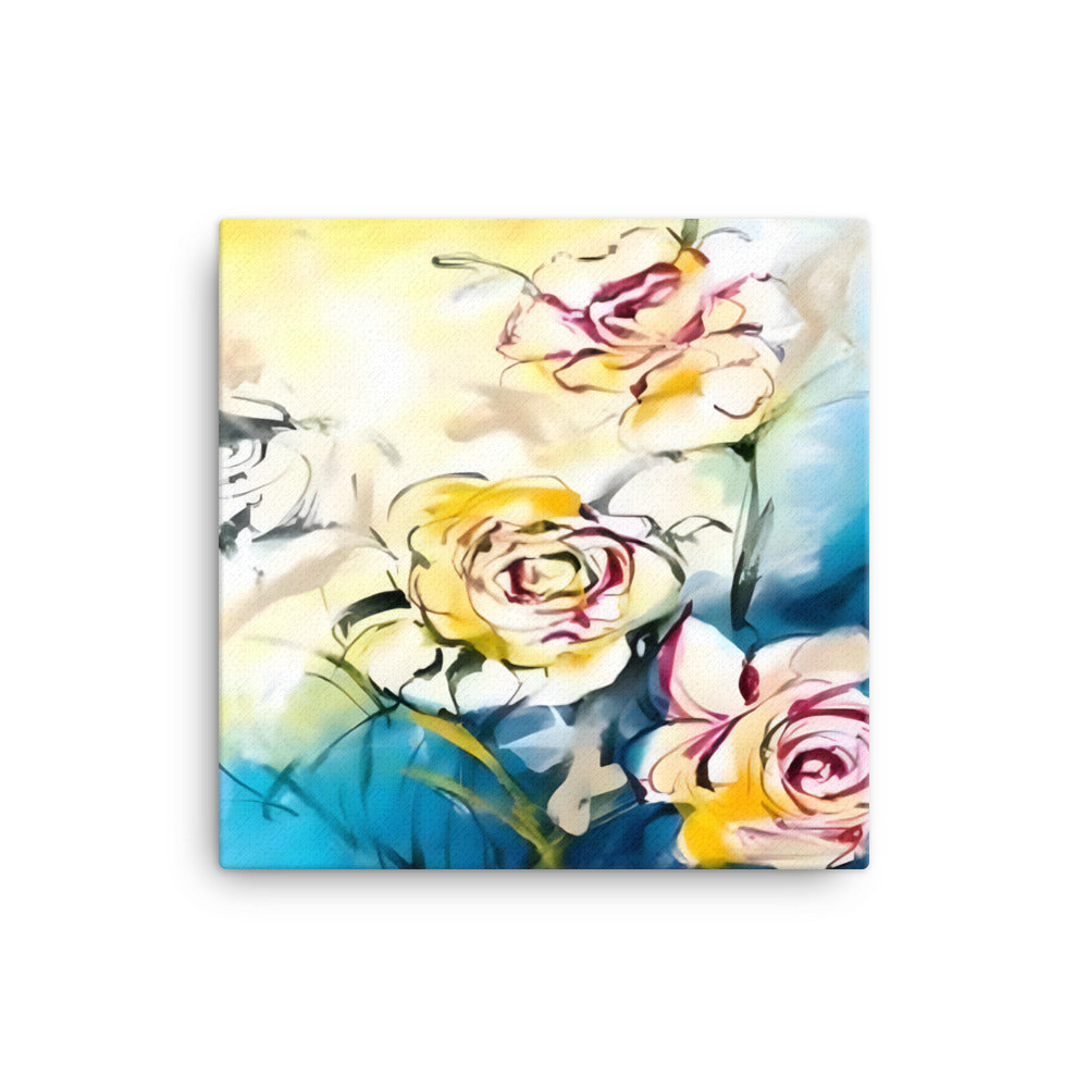 Introducing a stunning piece of wall art that is sure to capture your heart! This beautiful canvas print features three vibrant flowers in white, red, and yellow, set against a tranquil blue, white, and yellow background.