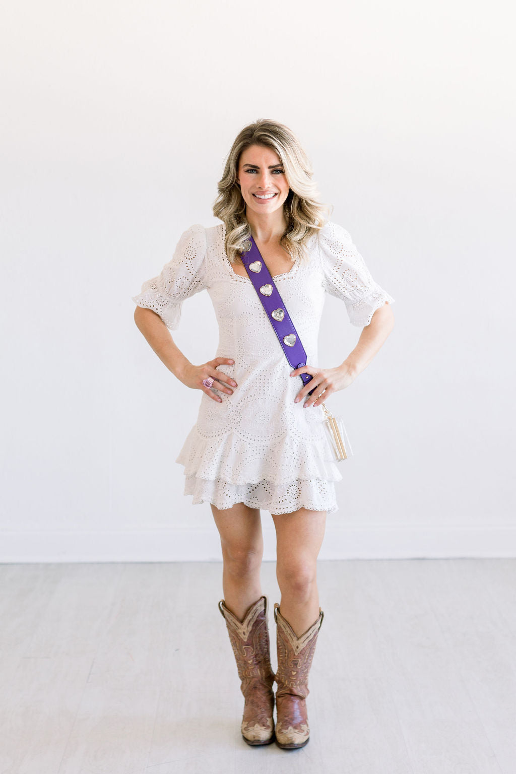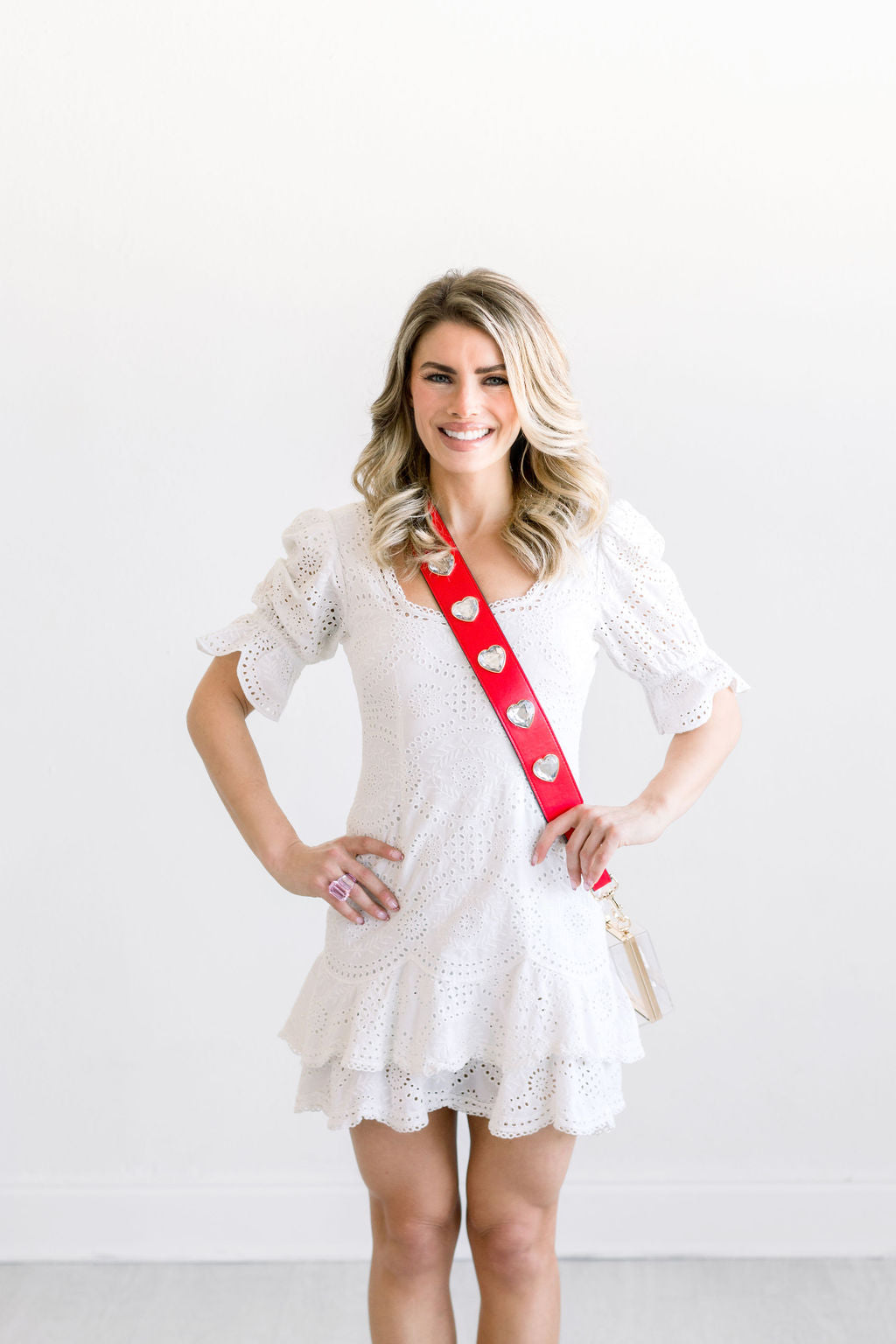 Leather purse straps embellished with crystal hearts & gold hardware. Finish the look with matching clear acrylic stadium bag *SOLD SEPARATELY*.