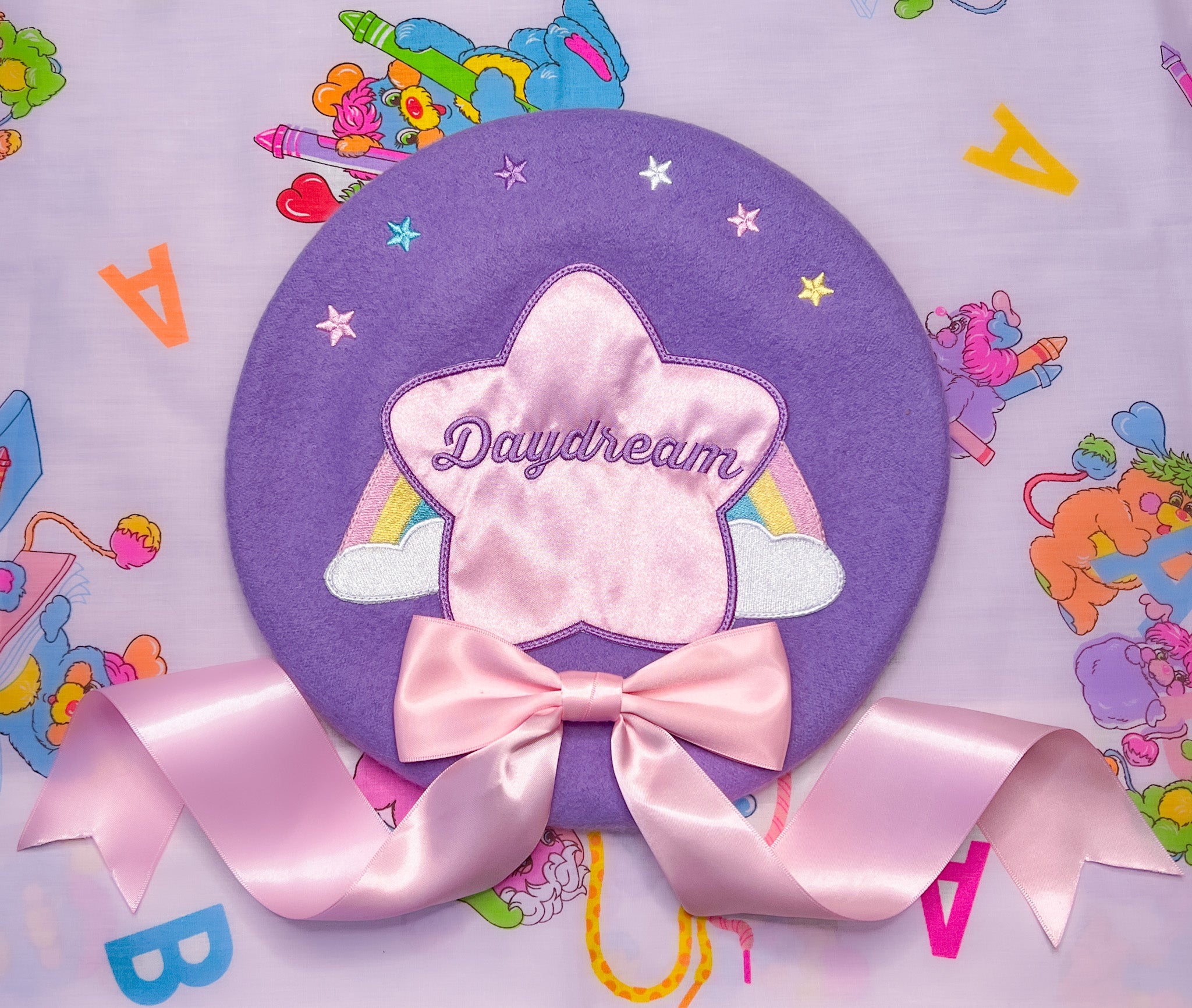 Berets are approximately 10.5 inches across, with a hole diameter of about 5.5 inches. These berets are 100% wool are a "one size fits most" hat. They are made of soft purple wool and feature a charming pink satin embroidered applique. They come with a detachable bow pin, 5.5 inches wide with tails ~11 inches long.
