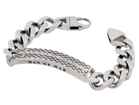 Men's Solid 316L stainless steel brush finished bracelet with lobster clasp. Fully engraved on all 4 sides with black enamel filling. Top of Bracelet has engraved and thinly filled diamond back pattern. Bracelet is 8” in length (standard men’s fit) and weighs a full 75 grams. Every order comes with complimentary velvet gift bag. Orders ship in 1-2 business days from Phoenix, Arizona.