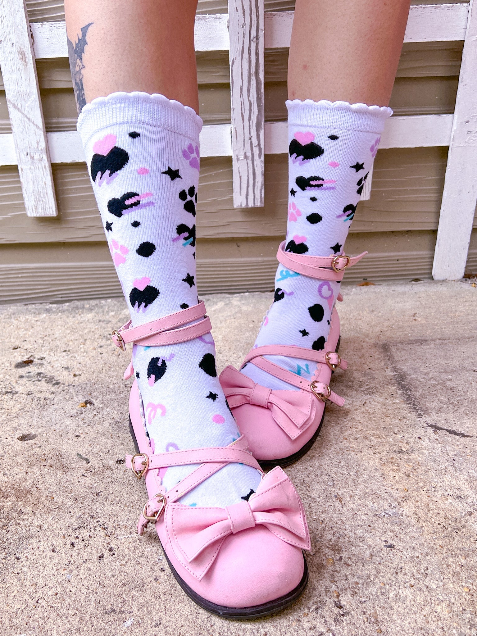 ⭐️ Can generally fit a women's size 6-10. If one-size-fits-most socks work for you, these likely will too. Check out the photos of the lavender spooky socks for more precise measurements!