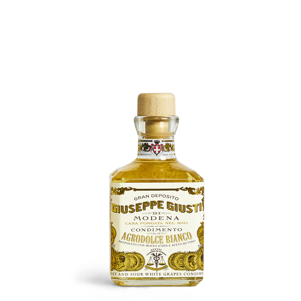 The Giusti White Condiment and the Balsamic Vinegar of Modena 3 Gold Medals in a special box. One of the most iconic products of Giusti collections with unmistakable wood scents and soft aromas of cherry and vanilla, and a fresh condiment characterized by the fruity and floral aromas of white grapes. Two pleasant and balanced products that are able to enhance the taste of every dishes.
