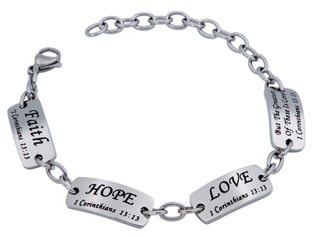 Women's 316 L Stainless Steel, high polish Tab Link Bracelet with engraved, black enamel filled power point scripture of choice.  Every order comes with complimentary velvet gift bag. Orders ship in 1-2 business days from Phoenix, Arizona.