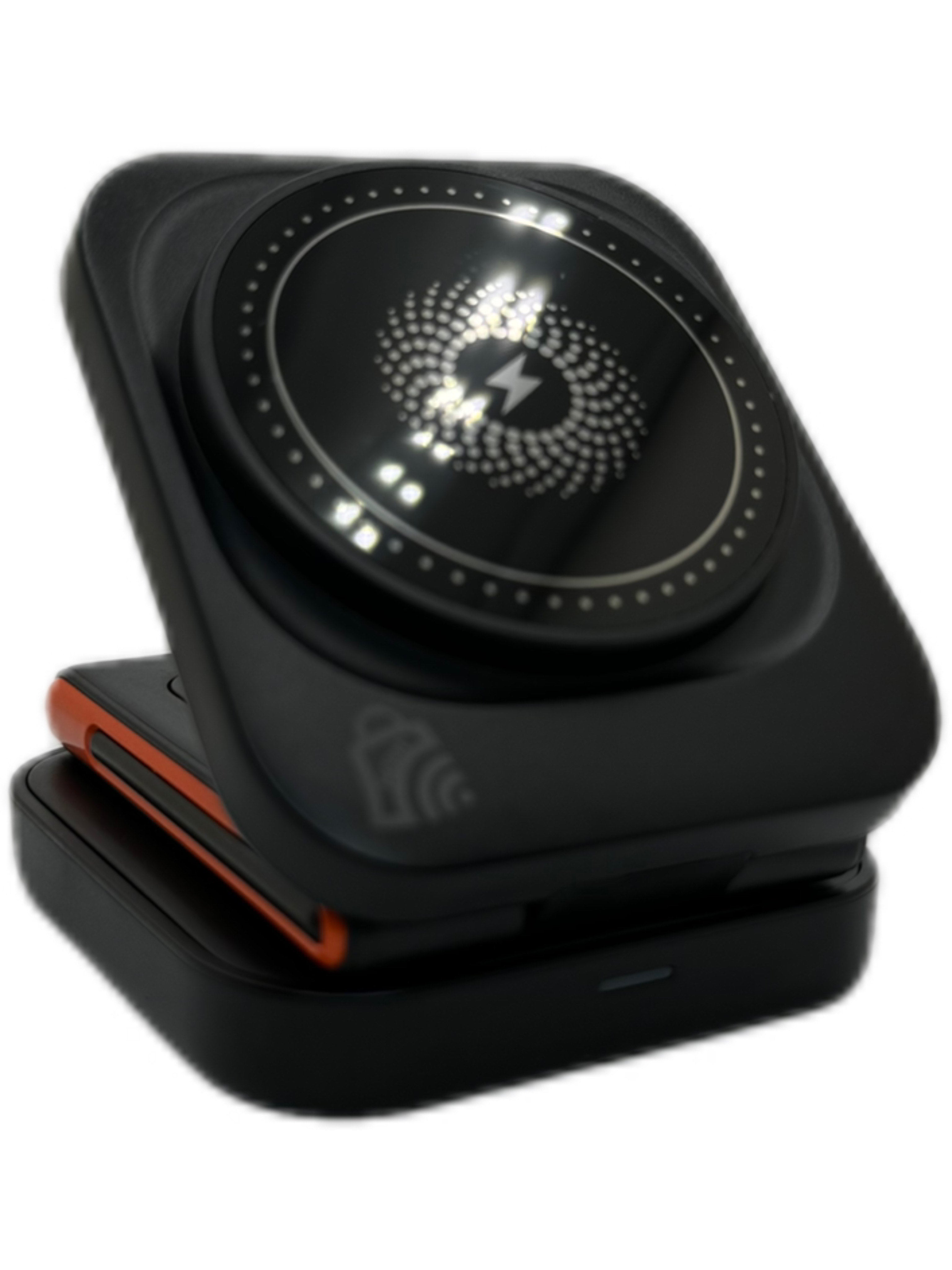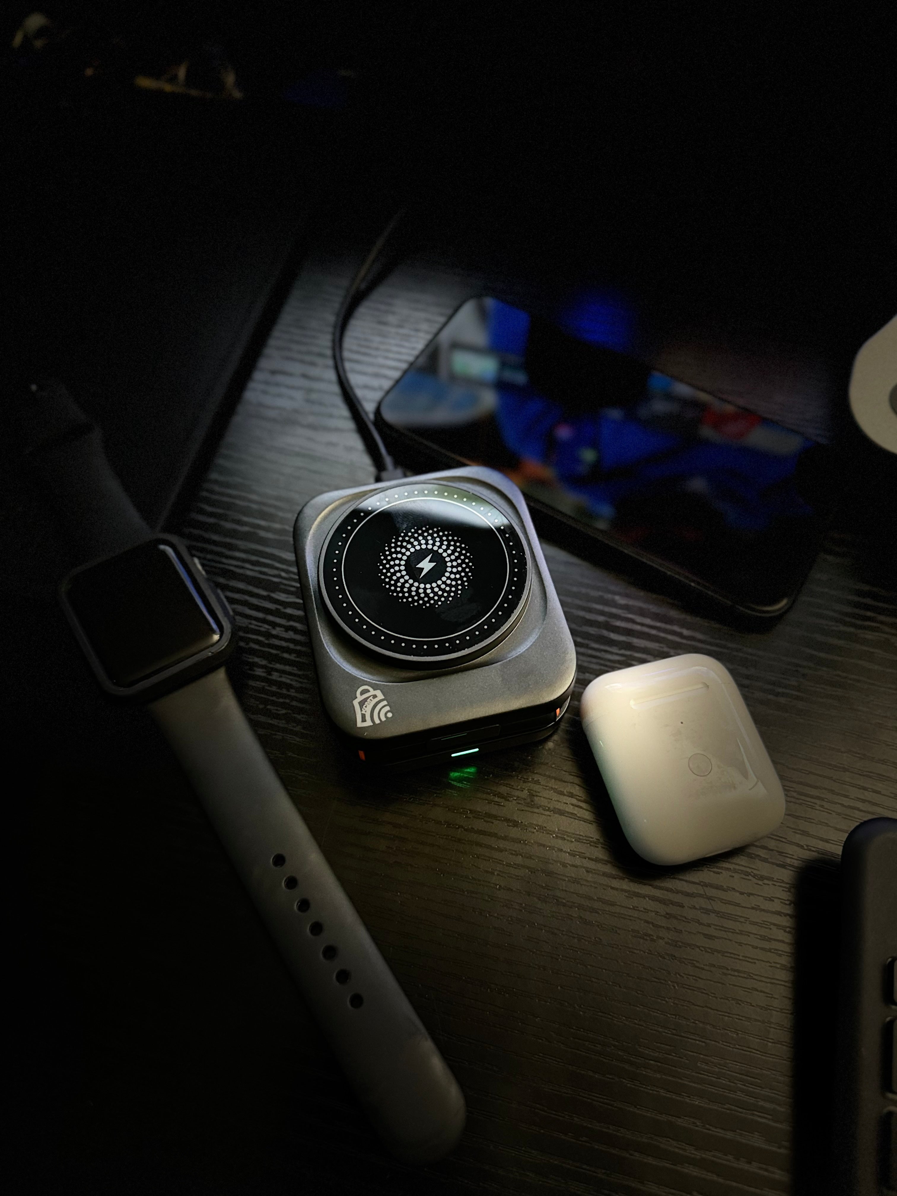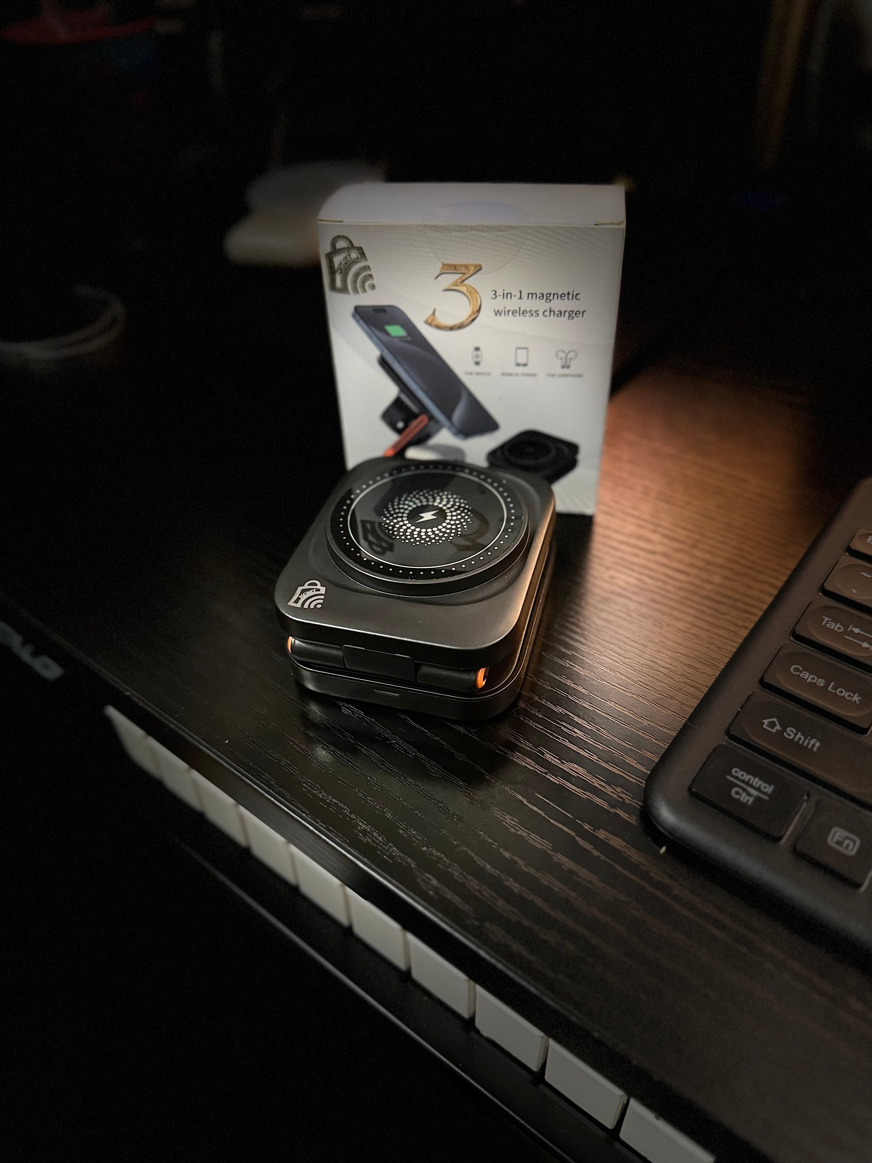 Introducing the KCMT 3-in-1 MagSafe Portable Charger, the ultimate on-the-go charging solution, as small as your palm, for your Apple devices. This sleek and compact charger features the latest MagSafe technology, making it compatible with iPhone 12 and later models, as well as other Qi-compatible devices. The 3-in-1 design allows you to charge your iPhone, Apple Watch, and AirPods simultaneously, eliminating the need for multiple chargers. With a powerful 15W output, you can expect fast and efficient charging, without the hassle of tangled cords. Whether you're traveling, working, or simply on the move, the KCMT 3-in-1 MagSafe Portable Charger is the perfect addition to your tech accessories. Say goodbye to low battery anxiety and stay connected at all times with this innovative and reliable charging solution.