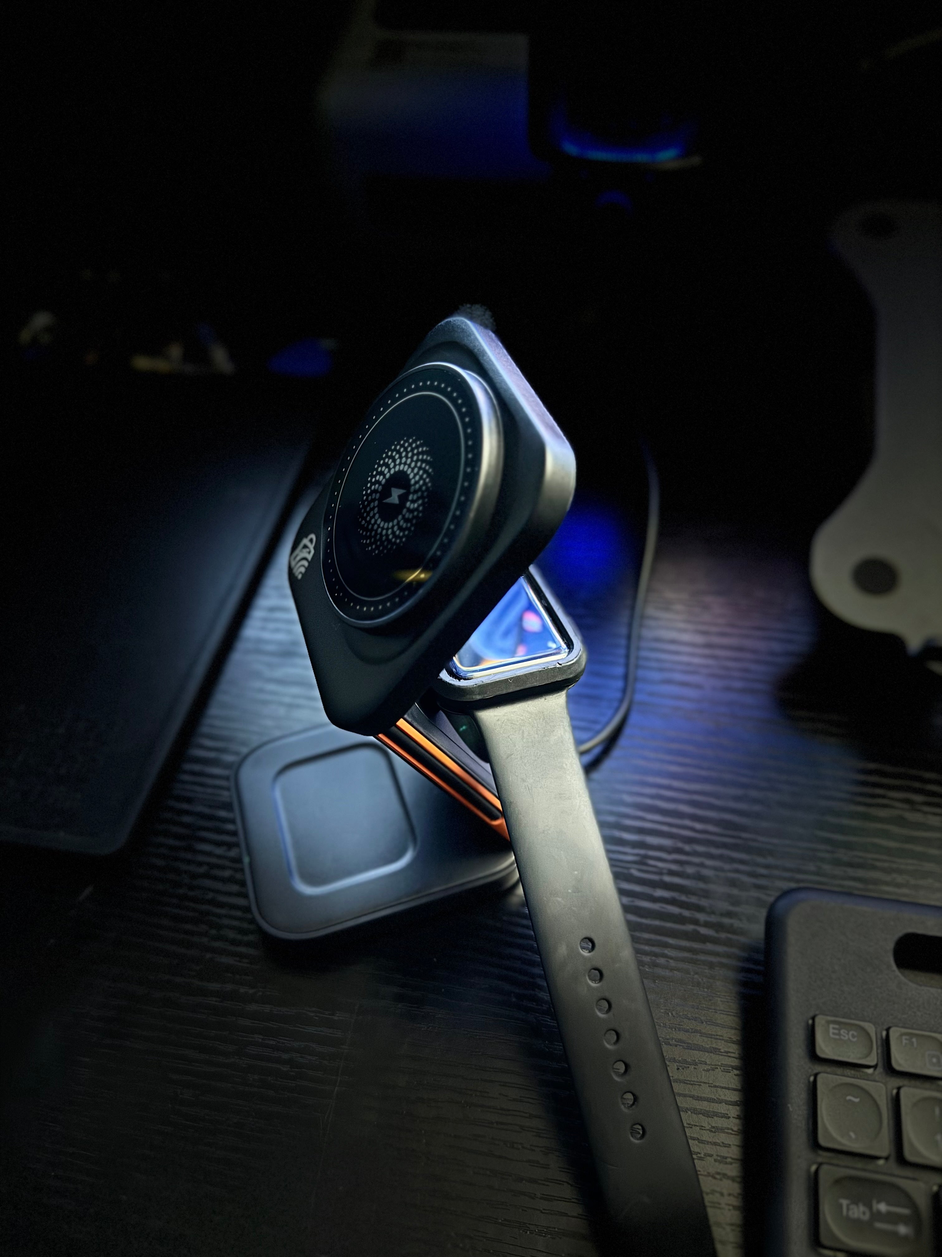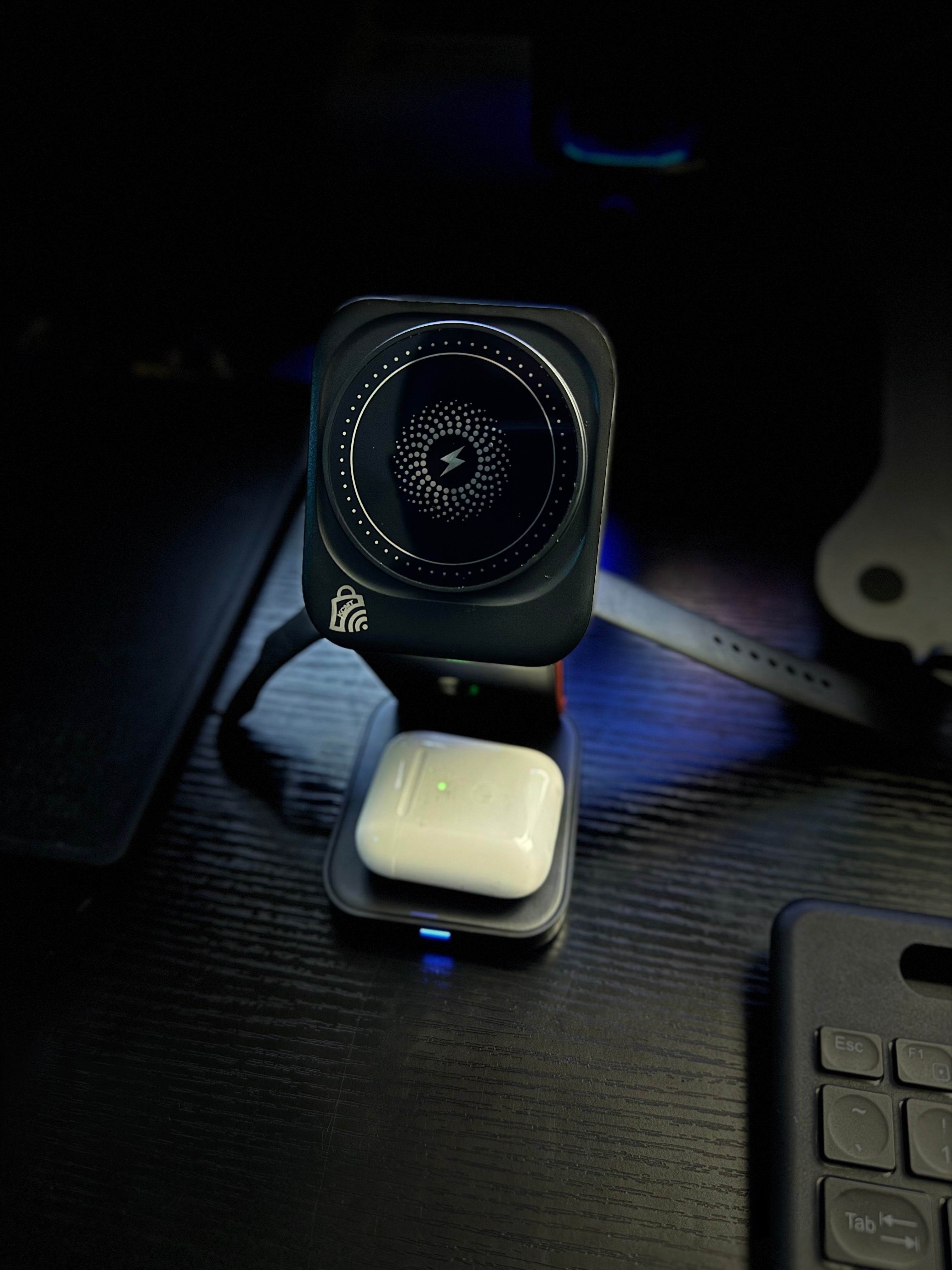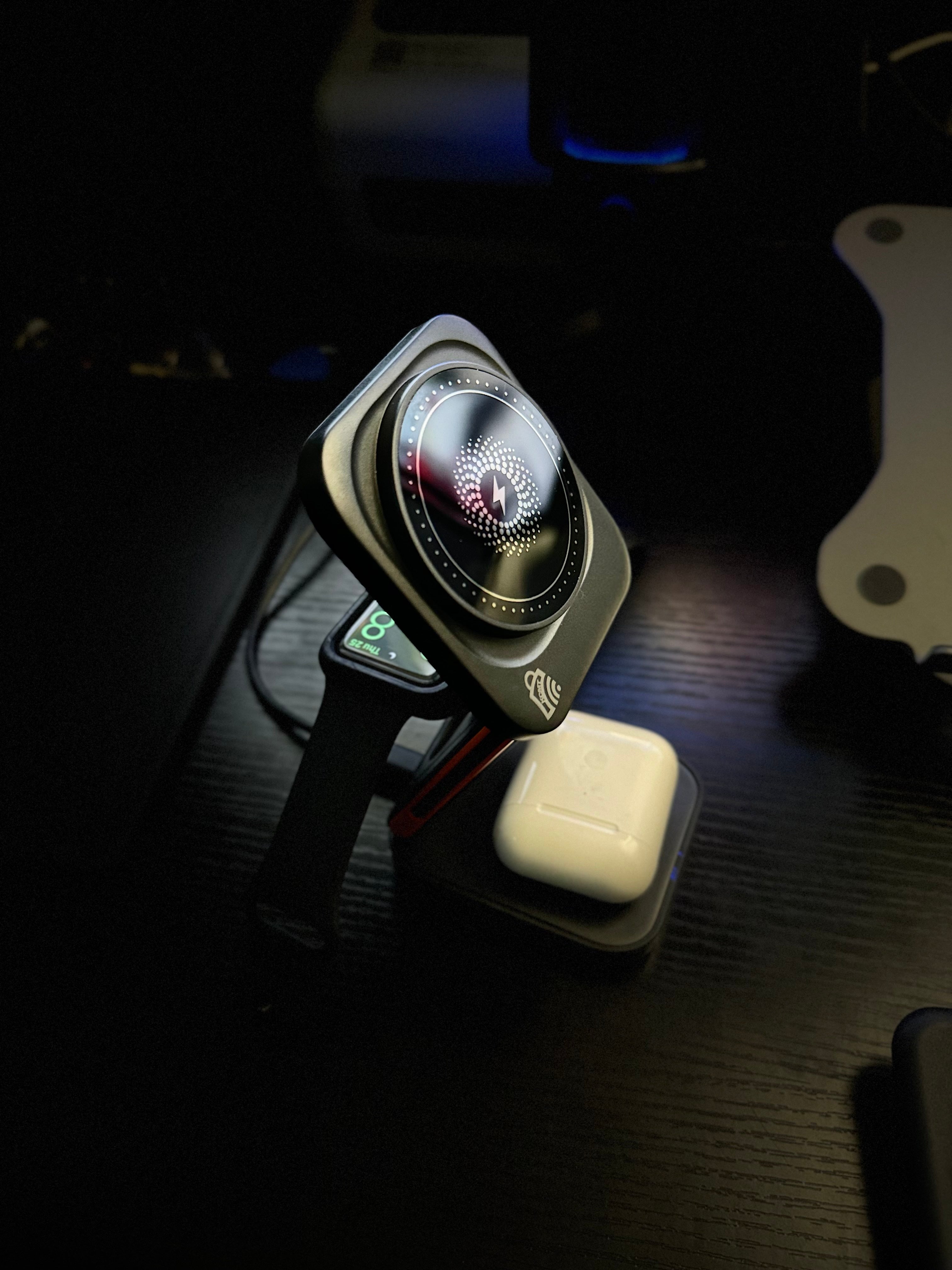 Introducing the KCMT 3-in-1 MagSafe Portable Charger, the ultimate on-the-go charging solution, as small as your palm, for your Apple devices. This sleek and compact charger features the latest MagSafe technology, making it compatible with iPhone 12 and later models, as well as other Qi-compatible devices. The 3-in-1 design allows you to charge your iPhone, Apple Watch, and AirPods simultaneously, eliminating the need for multiple chargers. With a powerful 15W output, you can expect fast and efficient charging, without the hassle of tangled cords. Whether you're traveling, working, or simply on the move, the KCMT 3-in-1 MagSafe Portable Charger is the perfect addition to your tech accessories. Say goodbye to low battery anxiety and stay connected at all times with this innovative and reliable charging solution.