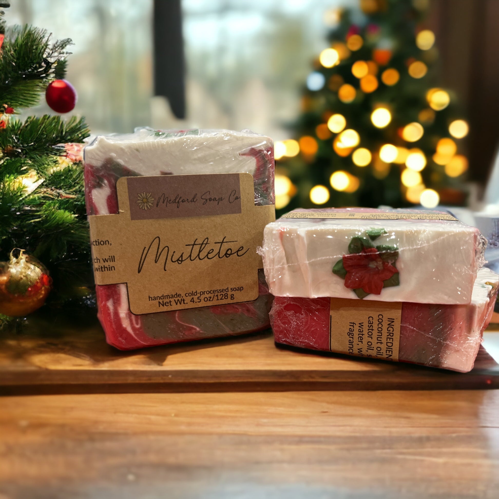 The classic scents of the Christmas season come through in this red, white and green-swirled 100% vegan soap. It is festively topped with either a poinsettia or red & green soap sprinkles. The scent-notes of this uplifting scent are: fir, camphor, balsam, red currant, soft pine, cypress, cardamom and clove.