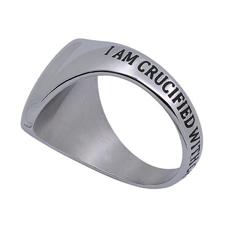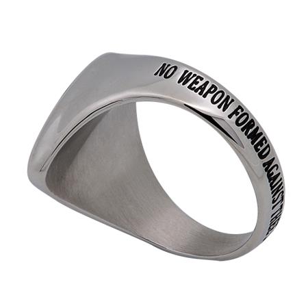 Men's High polish stainless steel ring with high polish cross on black matte finish shield. Engraved and black enamel filled scripture of choice wraps band. Every order comes with complimentary velvet gift bag. Orders ship in 1-2 business days from Phoenix, Arizona.
