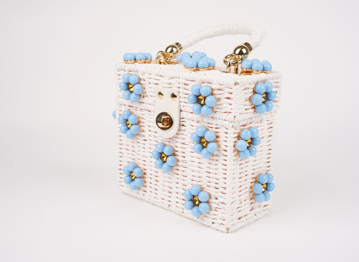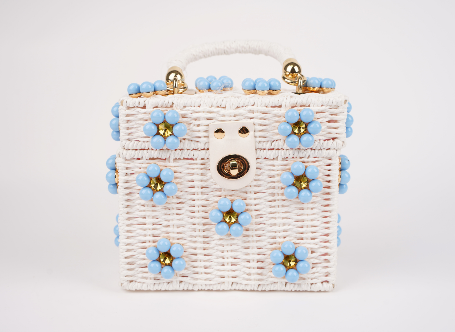 White Purse + Baby Blue Daisy with Yellow Rhinestone Center