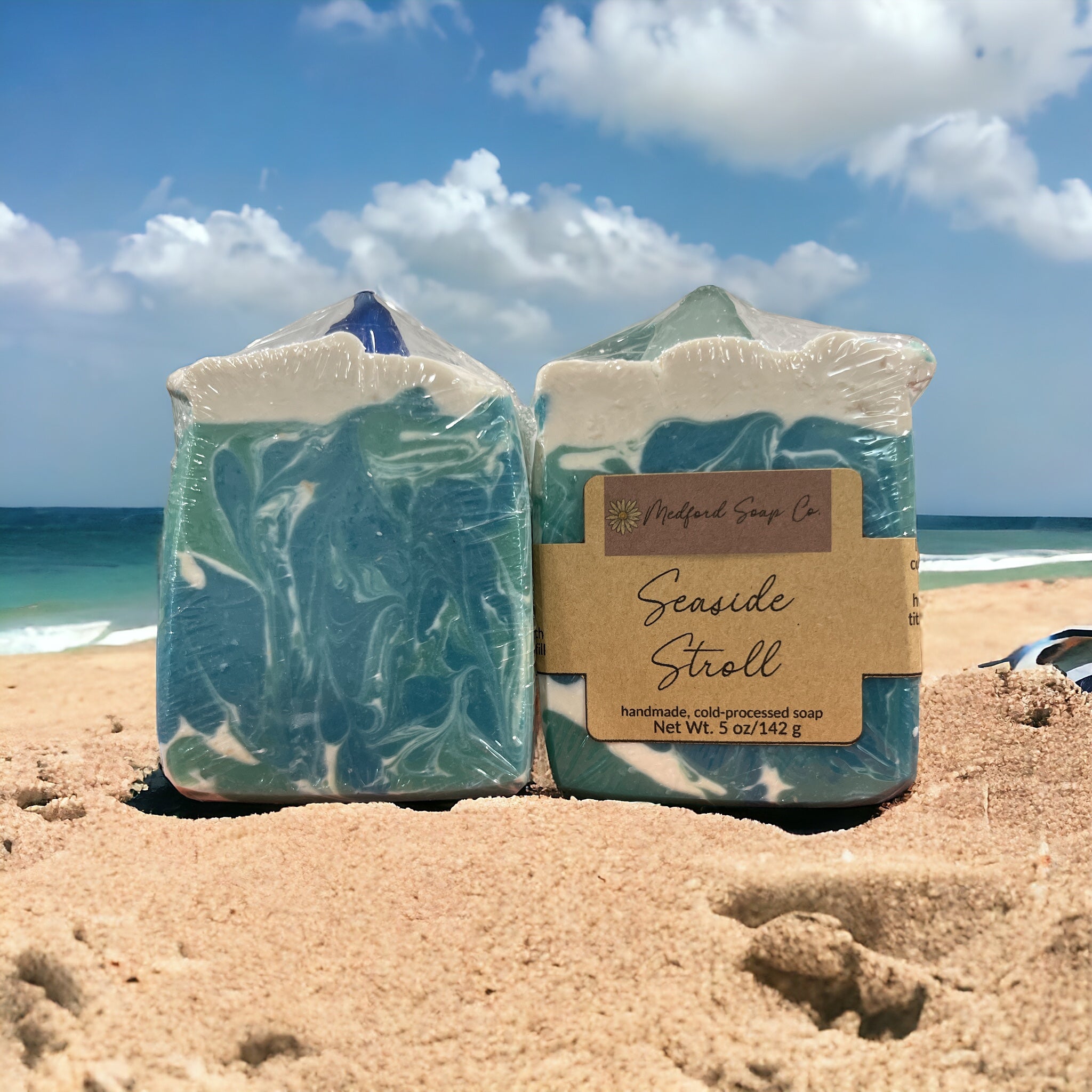 Looking at, and breathing in the scent of, this beautiful soap will convince you that you are sitting seaside. The soap frosting on the top is meant to simulate the rolling sea foam atop waves lapping the shore; and each piece comes with a real piece of sea glass embedded on the top. This soap makes a beautiful gift, or would be a great treat for yourself. This soap is 100% and your skin will love the perfect balance of natural oils and butters.