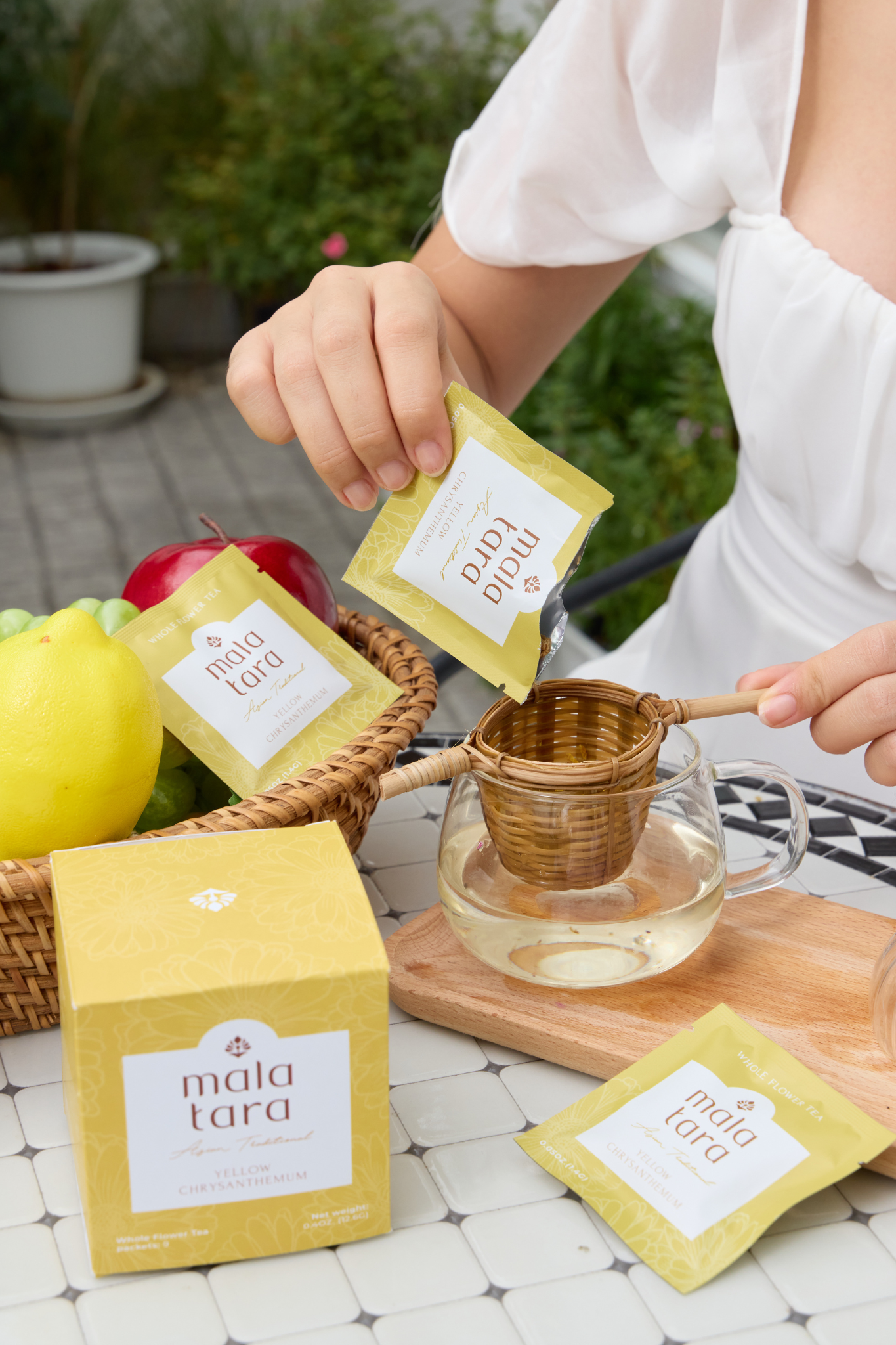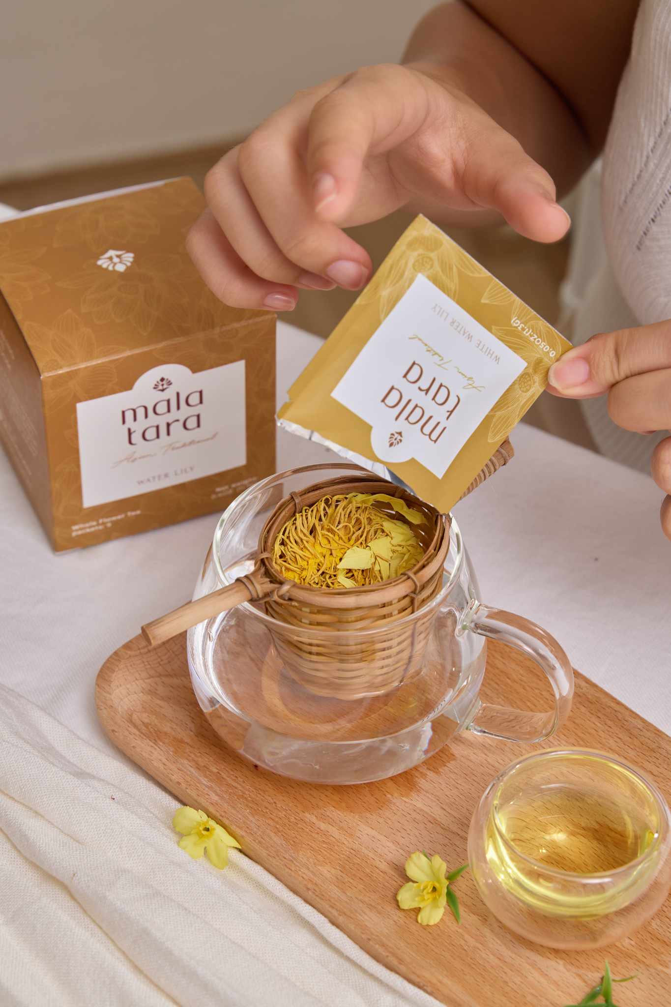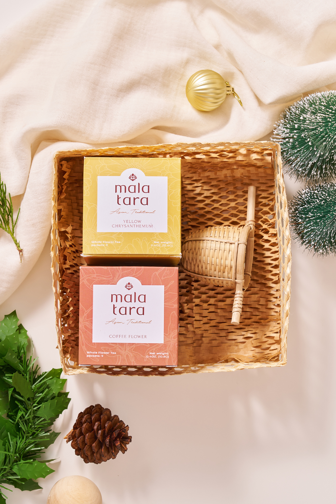 Elevate your tea rituals with the Serenity Deluxe Gift Box, designed for those who seek balance and mindfulness. This premium flower tea gift set includes two boxes of organic whole flower teas (your choice of flavors) and a hand-woven bamboo tea strainer, combining variety and eco-conscious brewing. The biodegradable bamboo strainer is both elegant and sustainable, making this the perfect gift for wellness enthusiasts or mindful tea drinkers. This herbal tea gift box is the perfect wellness gift for those who value sustainable and calming rituals.
