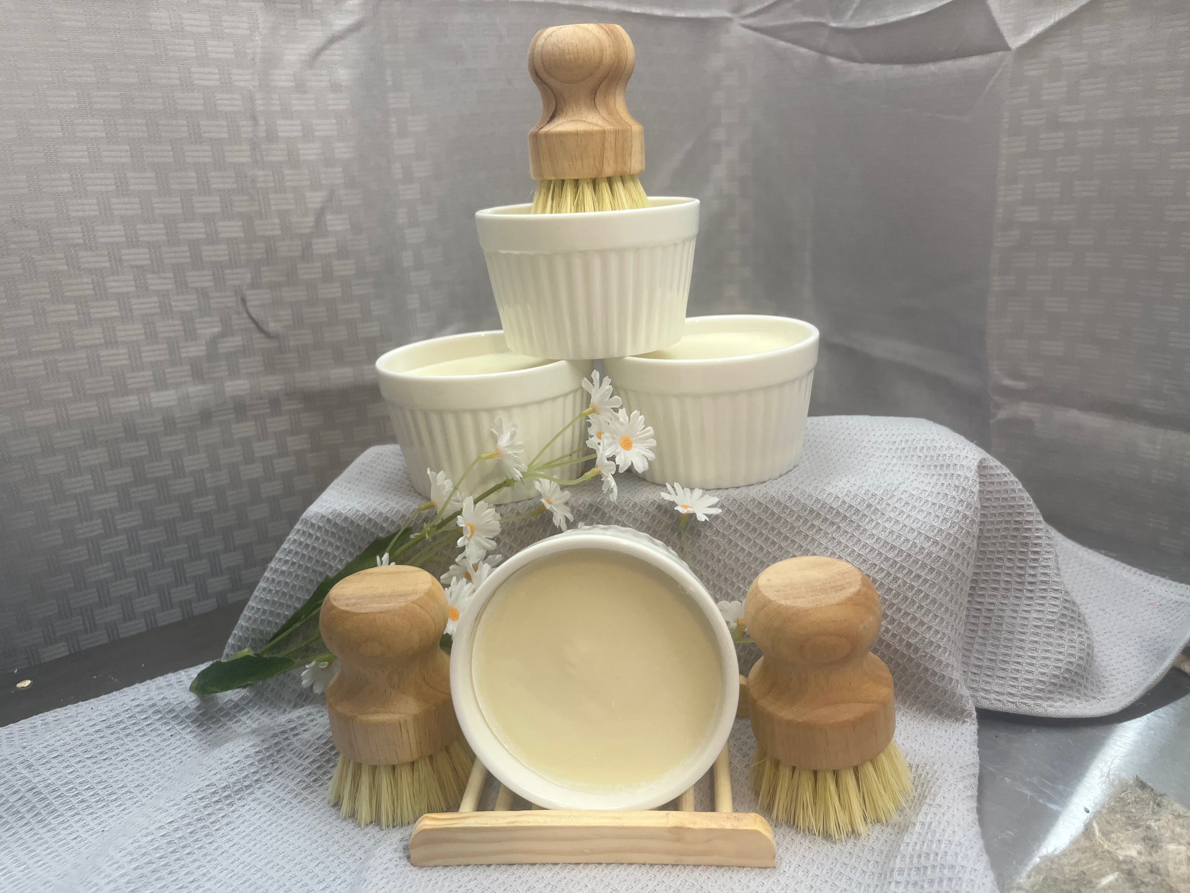 For your first purchase, we suggest our 'starter set' which gives you a 6 oz solid dish soap in a reusable ceramic ramekin.  You also will be getting a scrub brush with a bamboo wooden handle and natural sisal bristles.  When you use up your first solid dish soap (which could take 4-5 months!), you can order one of our refills (no ramekin);  or another ramekin-filled dish.