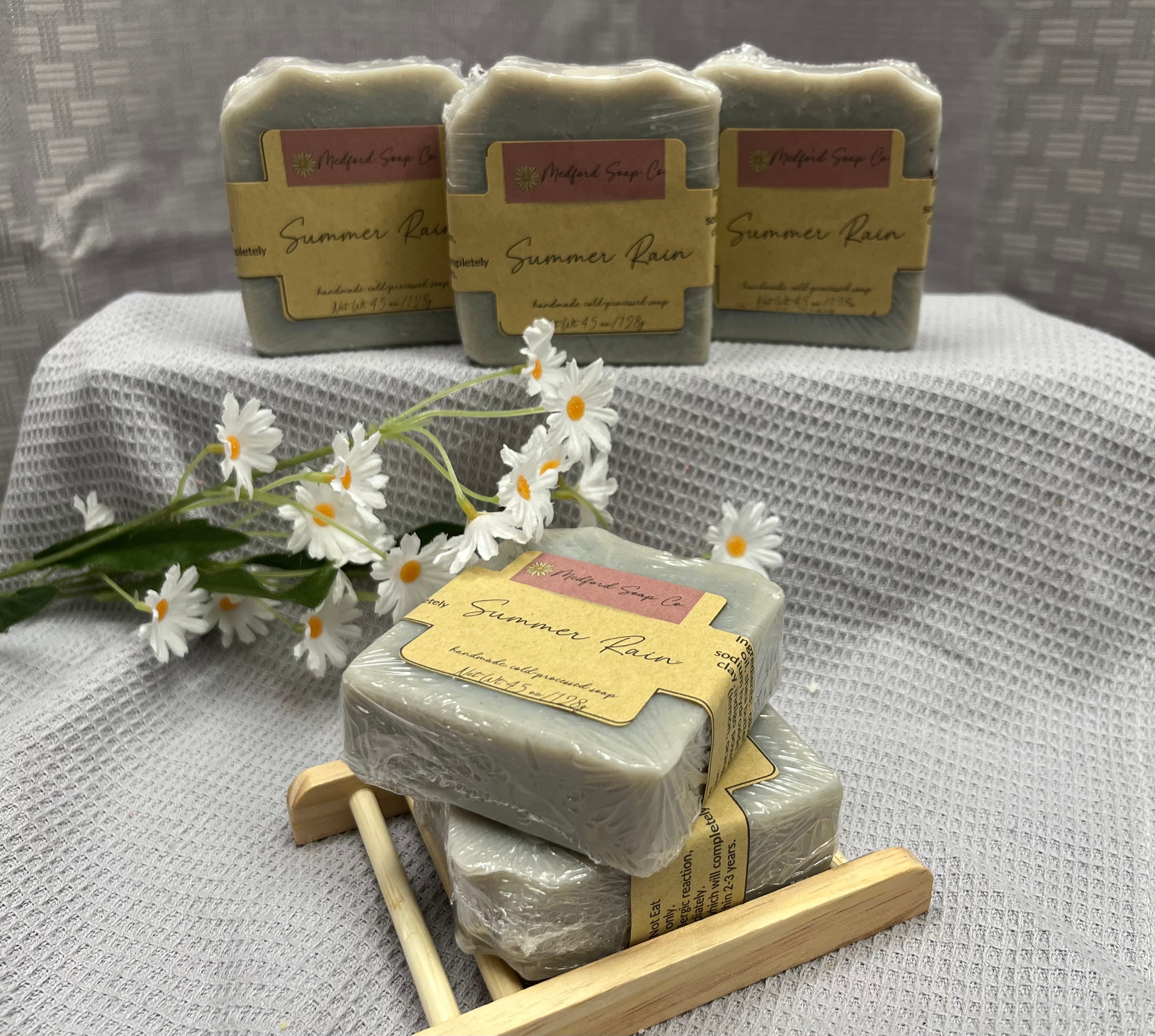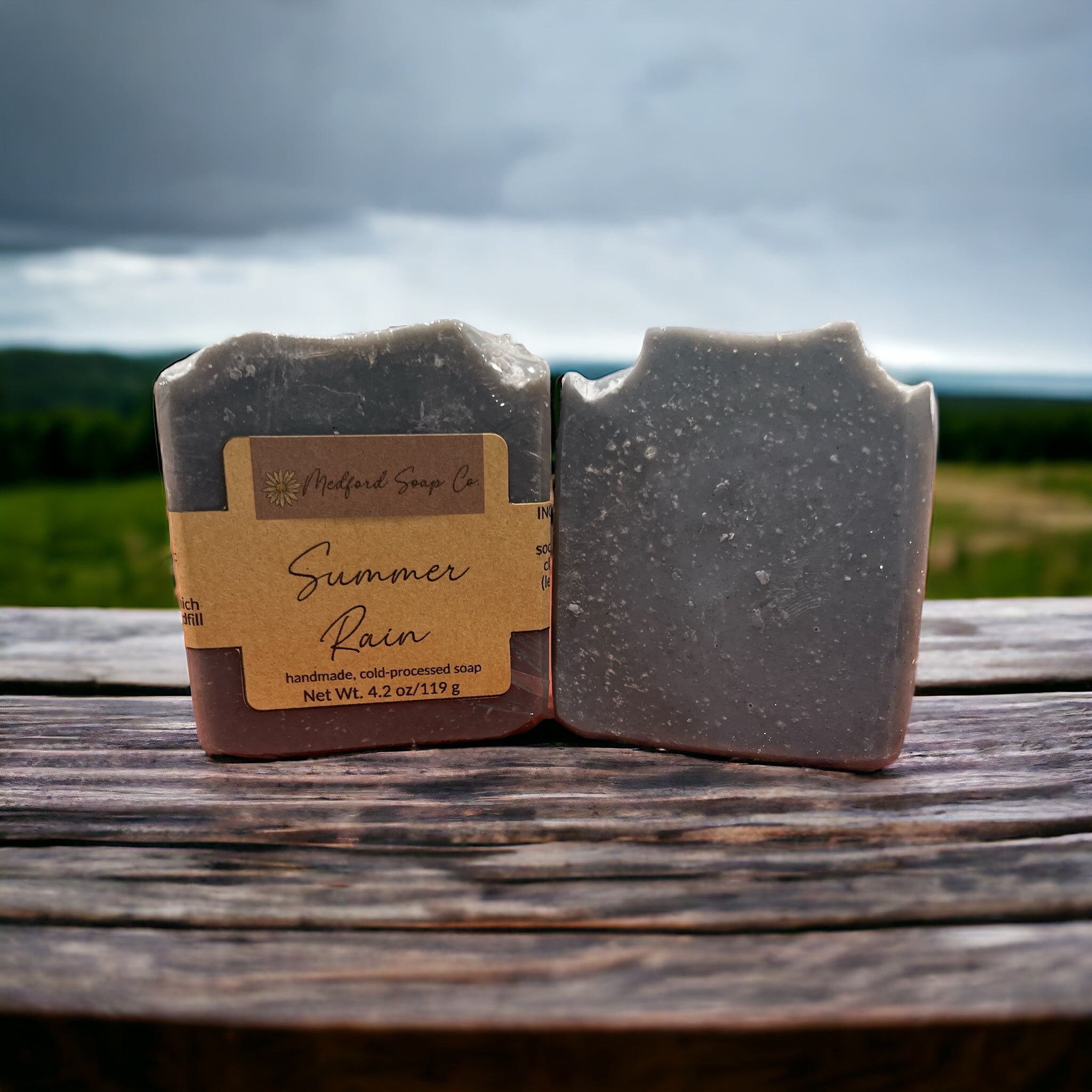 This soap replicates that dewy, humid, fresh scent after a warm summer rain. This all-natural soap is 100% vegan, colored naturally with indigo powder and scented only with essential oils. While your skin is being nourished and cleansed with the high-quality oils and butters, you'll be soothed by the refreshing smell.