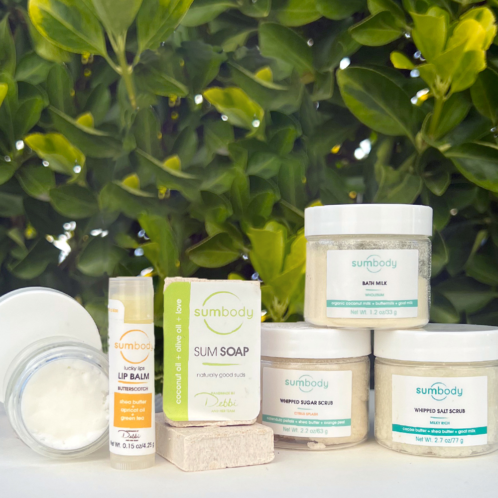 The set includes Lucky Lips Lip Balm, 2oz Whipped Salt Scrub, 2oz Sugar Scrub, 1oz lotion, 2oz Bath Milk, and 1 oz bar soaps. Beware, these products are genuinely addictive! Once you've tried Sumbody, there's no looking back.