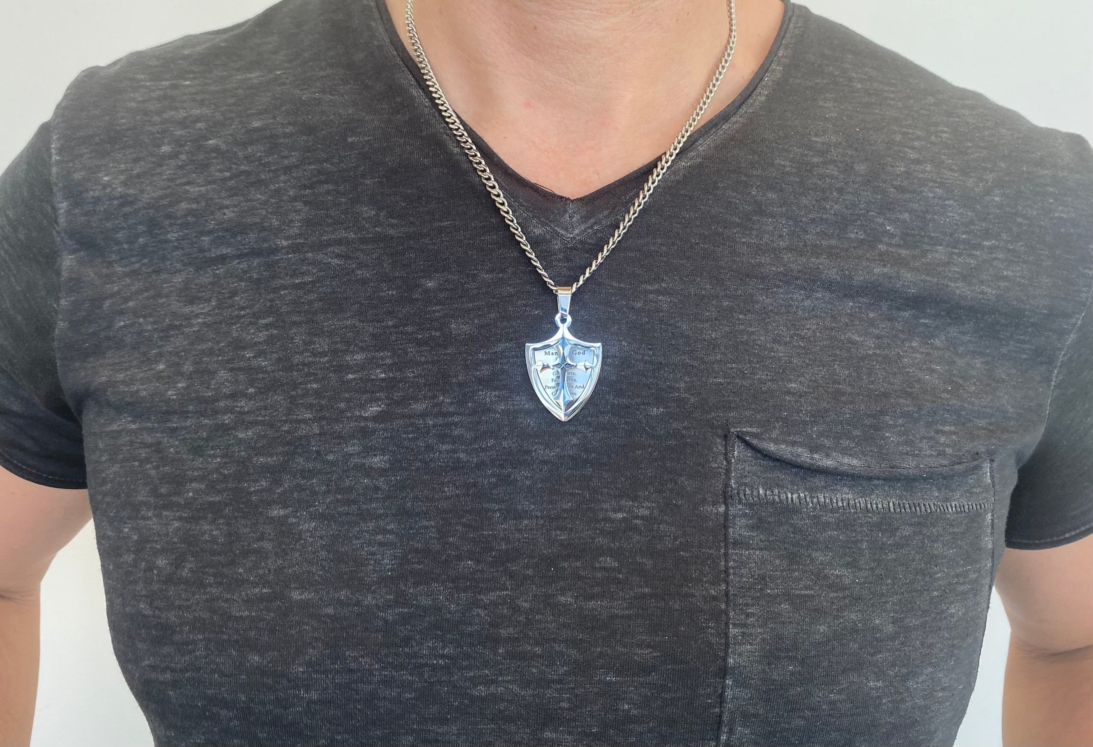 Men's Stainless Steel, high polish 2 piece shield cross with engraving and black enamel filled wording. Front and back piece are fully rotational. Shield measures a 1 1/4" x 3/4". Includes upgrade stainless steel curb chain in 20” or 24”. Every order comes with complimentary velvet gift bag. Orders ship in 1-2 business days from Phoenix, Arizona.
