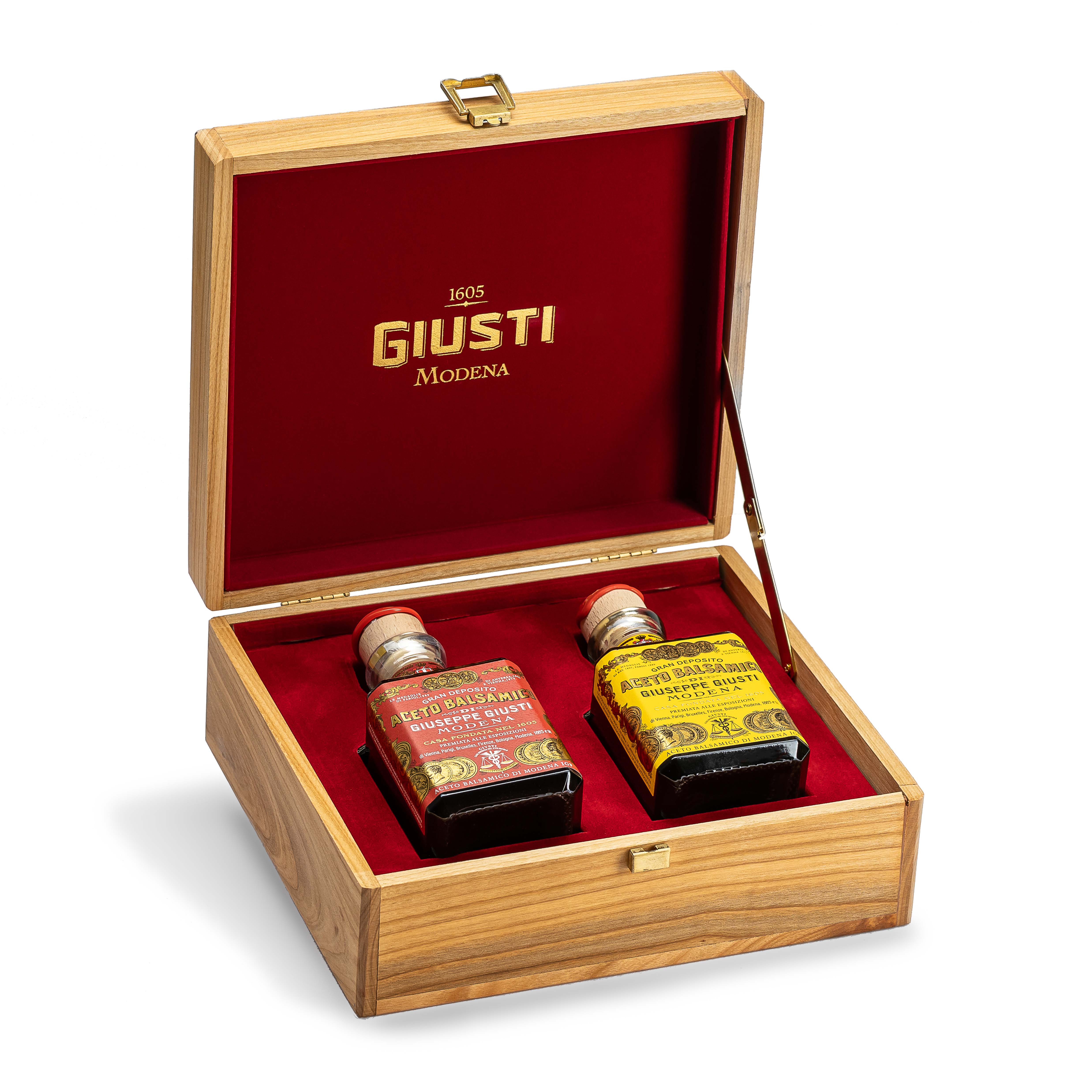 An elegant wooden box lined in red velvet that contains two iconic Balsamic Vinegars of Modena within Giusti Historical Collection: 3 and 4 Gold Medals.